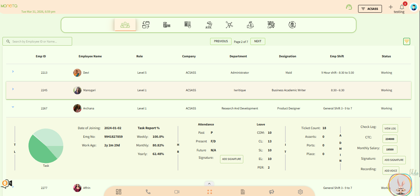 Moneta, the Human Resource Management System (HRMS) coupled with Project Management System (PMS), redefines efficiency and transparency in managing your workforce. With Moneta, leave management, task management, and payrolls are efficient, saving valuable time and reducing errors. Real-time communication, clear dashboards, and detailed performance insights foster transparency, boosting organizational efficiency.